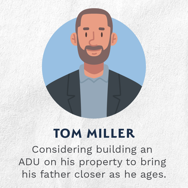 Tom Miller, a fictional 42 year old West Michigan professor, husband, and father of two, is looking for a housing option that offers both privacy and proximity for his aging father. With limited knowledge, he thought an ADU might offer the right balance.
